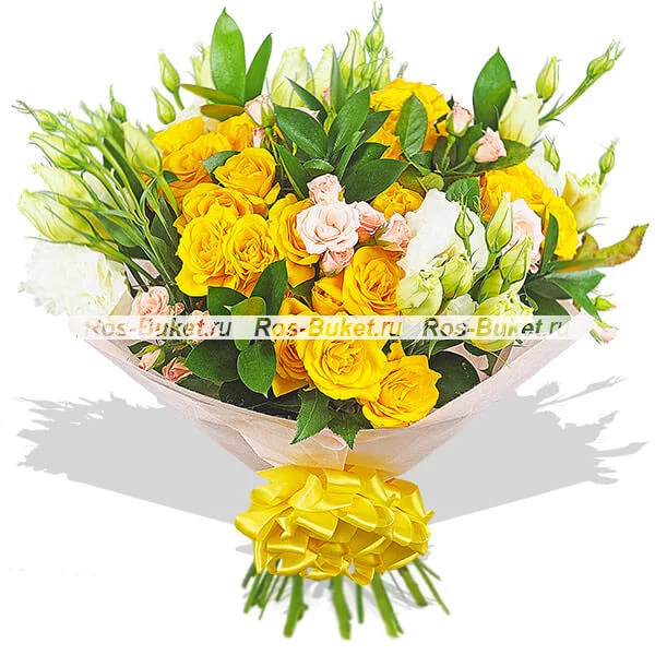 Стандартный (на фото): роза кустовая желтая - 5 шт, роза кустовая розовая - 3 шт, эустома белая - 5 шт, рускус, фетр розовый, бант желтый.
